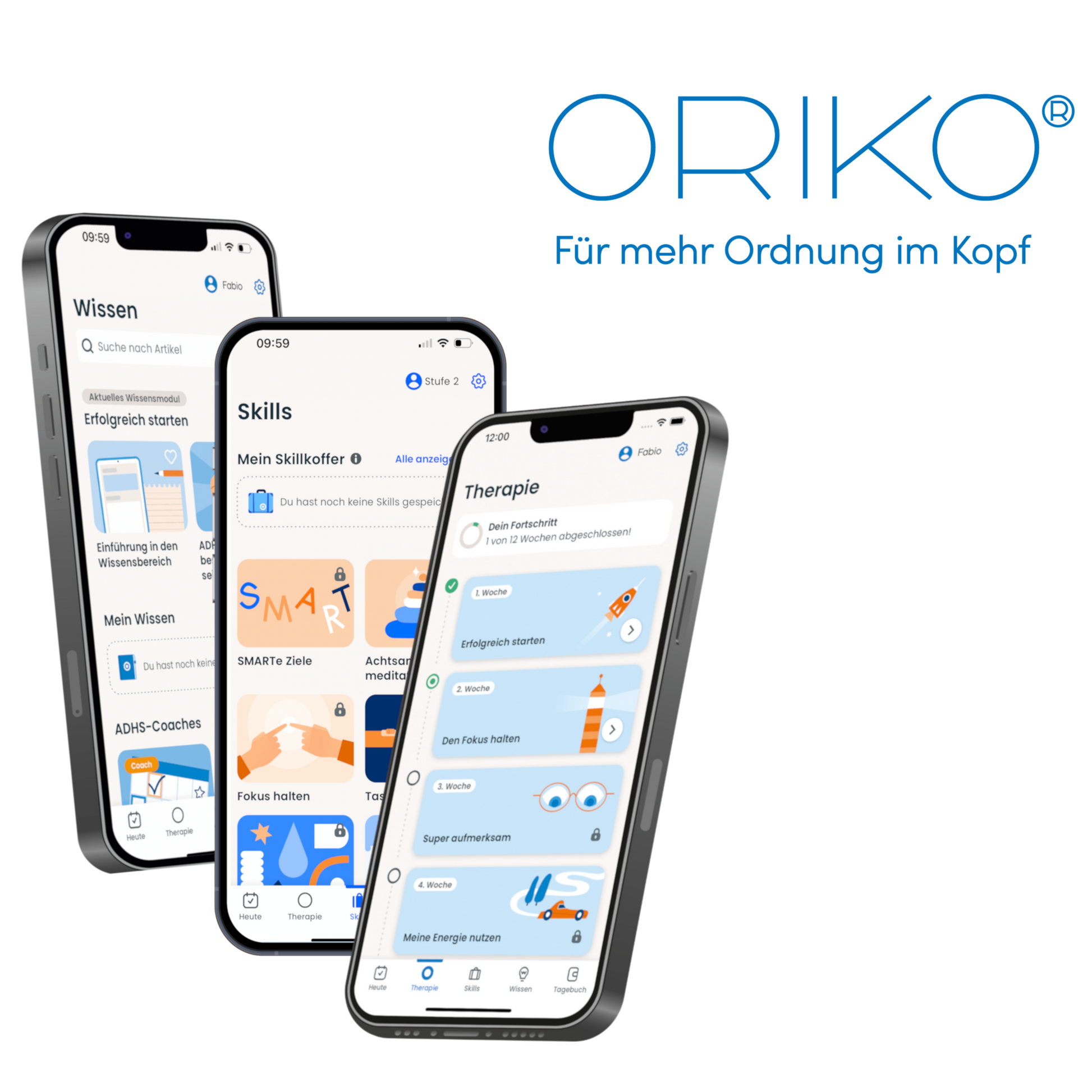 ORIKO® ist eine digitale Therapie-App, die speziell für Erwachsene mit Aufmerksamkeitsdefizit-Hyperaktivitätsstörung (ADHS) entwickelt wurde. Sie bietet eine strukturierte, verhaltenstherapeutisch fundierte Unterstützung zur Bewältigung des Alltags mit ADHS. Die App wurde in Zusammenarbeit mit Psychiater:innen, Therapeut:innen, medizinischen Software-Entwickler:innen und Betroffenen entwickelt und getestet.
