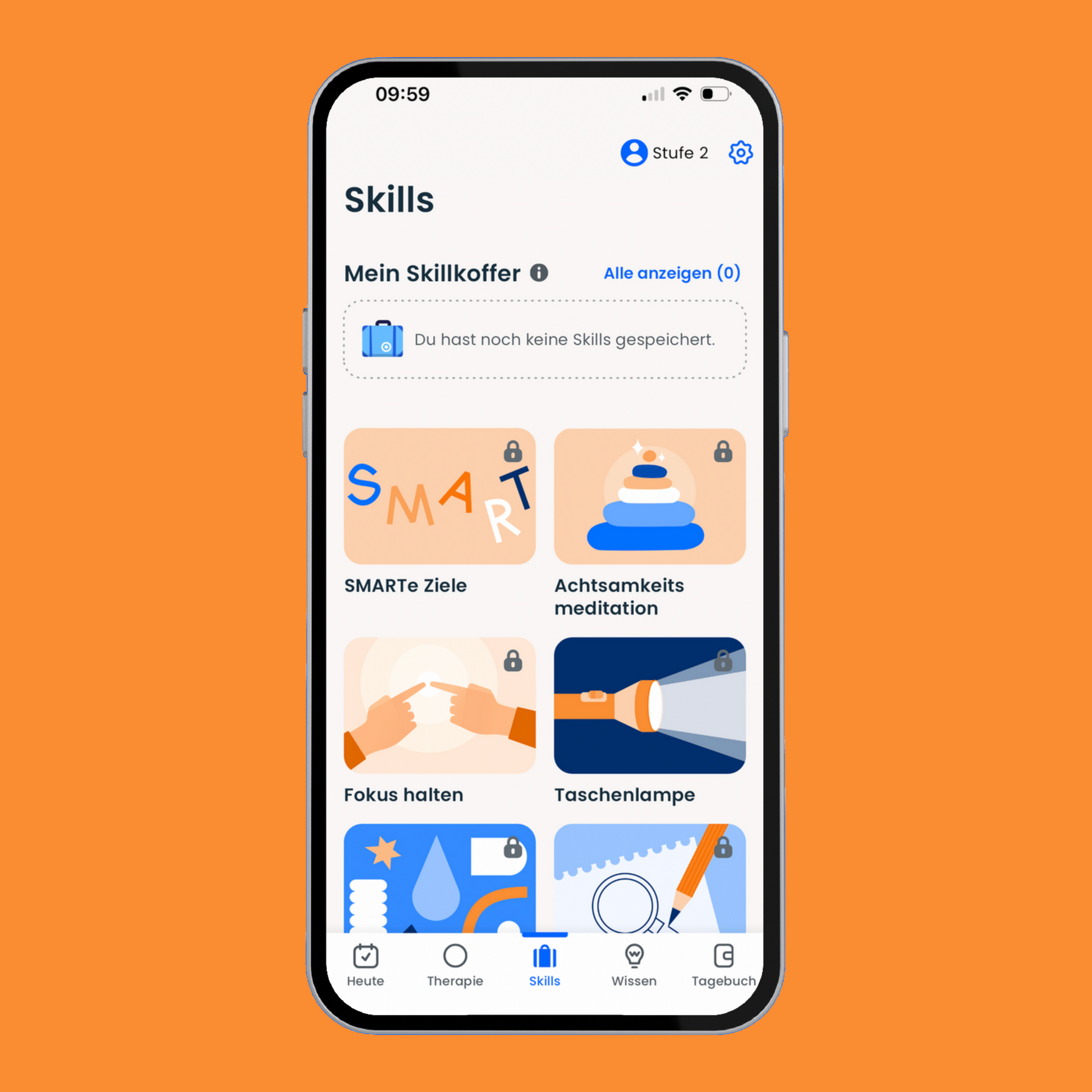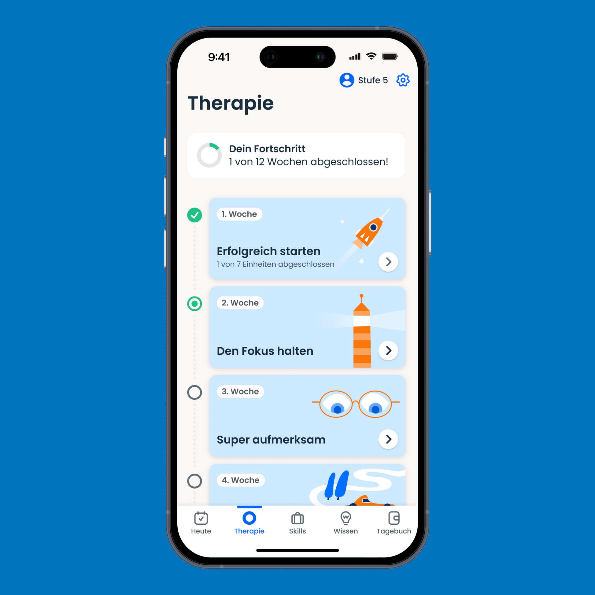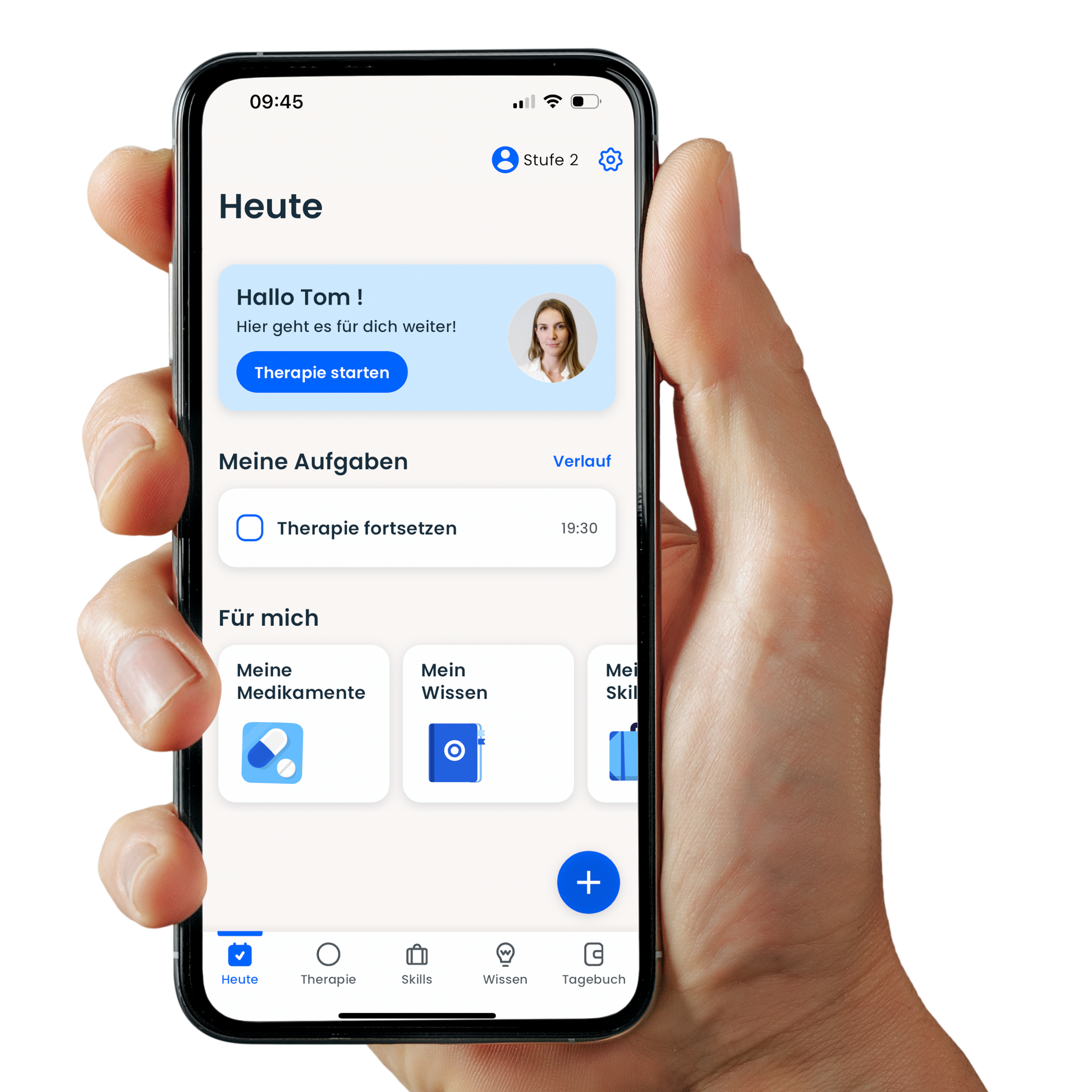 12 therapeutische Module: Die App führt durch 12 Therapieschritte, die umfassendes Wissen, verhaltenstherapeutische Übungen, einfache Skills-Trainings und positive Lernerfahrungen beinhalten.
